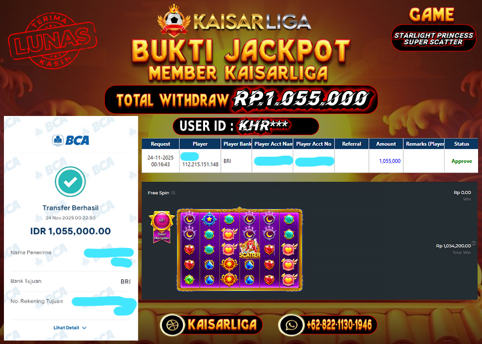 Kabar gembira datang dari dunia slot online! Salah satu member setia KAISARLIGA, dengan User id khr*** baru saja meraih kemenangan besar sebesar RP. 1.055.000.- di permainan Starlight Princess Super Scatter. Kemenangan ini bukan sekadar angka, melainkan bukti nyata komitmen KAISARLIGA sebagai situs slot gacor maxwin terpercaya yang selalu membayar penuh kemenangan para membernya.Proses pencairan dana berlangsung super cepat dan efisien. Setelah mengisi formulir withdraw, hanya dalam waktu 5-10 menit, pihak KAISARLIGA langsung melakukan transfer dana ke rekening pemenang. Bukti pembayaran sah dan valid ini didapatkan langsung dari tanda transfer transaksi bank tujuan, menegaskan transparansi dan integritas KAISARLIGA.