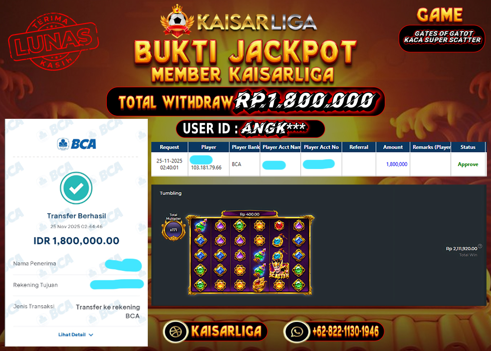Kabar gembira datang dari dunia slot online! Salah satu member setia KAISARLIGA, dengan User id angk*** baru saja meraih kemenangan besar sebesar RP. 1.800.000.- di permainan Gates of Gatot Kaca Super Scatter. Kemenangan ini bukan sekadar angka, melainkan bukti nyata komitmen KAISARLIGA sebagai situs slot gacor maxwin terpercaya yang selalu membayar penuh kemenangan para membernya.