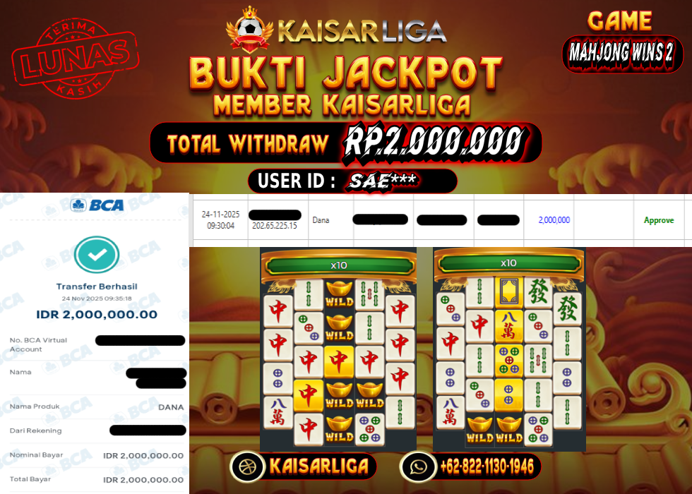 Kabar gembira datang dari dunia slot online! Salah satu member setia KAISARLIGA, dengan User id SAE*** baru saja meraih kemenangan besar sebesar RP. 2.000.000.- di permainan Mahjong Wins 2. Kemenangan ini bukan sekadar angka, melainkan bukti nyata komitmen KAISARLIGA sebagai situs slot gacor maxwin terpercaya yang selalu membayar penuh kemenangan para membernya.