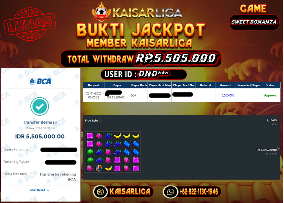 Kabar gembira datang dari dunia slot online! Salah satu member setia KAISARLIGA, dengan User id dnd*** baru saja meraih kemenangan besar sebesar RP. 5.505.000.- di permainan Sweet Bonanza. Kemenangan ini bukan sekadar angka, melainkan bukti nyata komitmen KAISARLIGA sebagai situs slot gacor maxwin terpercaya yang selalu membayar penuh kemenangan para membernya.